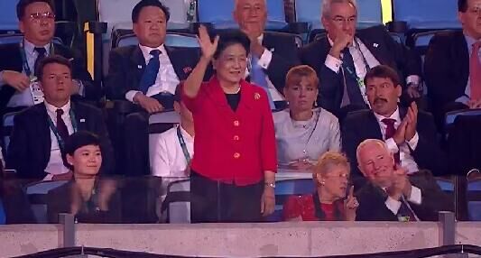 中国代表团第45个入场,雷声高举并且挥舞着国旗大步向前。国务院副总理刘延东作为习近平主席特别代表出席,她向中国代表团挥手致意。