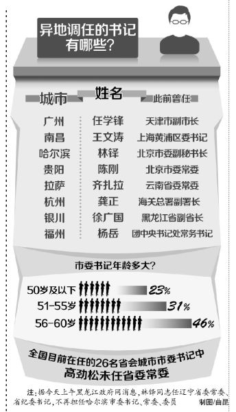 哈尔滨市委书记林铎、贵阳市委书记陈刚曾在北京任职。林铎在2006年到2007年间担任过西城区区委书记,离开北京调任贵州时任北京市委副秘书长一职。陈刚则在2006年到2012年期间担任过朝阳区区委书记,离开北京时任北京市委常委。